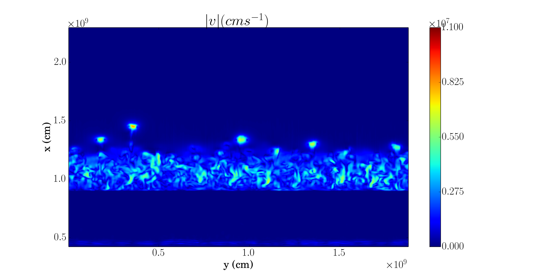 2D slice of the carbon shell simulation (512x512x512 zones). Shown is the computational domain for the x-y plane, the colormap represents the velocity magnitude. This snapshot is taken near the start of the simulation when turbulence is being initiated.